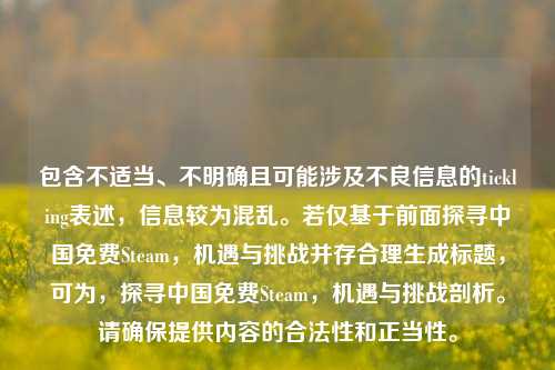 包含不适当、不明确且可能涉及不良信息的tickling表述,信息较为混乱。若仅基于前面探寻中国免费Steam,机遇与挑战并存合理生成标题,可为,探寻中国免费Steam,机遇与挑战剖析。请确保提供内容的合法性和正当性。