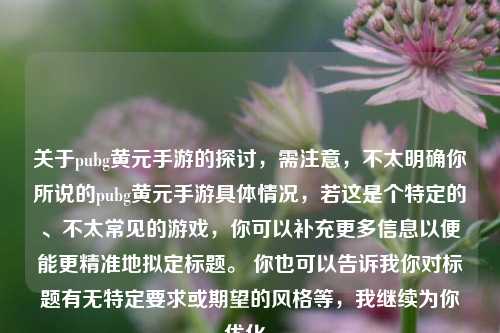 关于pubg黄元手游的探讨,需注意,不太明确你所说的pubg黄元手游具体情况,若这是个特定的、不太常见的游戏,你可以补充更多信息以便能更精准地拟定标题。 你也可以告诉我你对标题有无特定要求或期望的风格等,我继续为你优化。